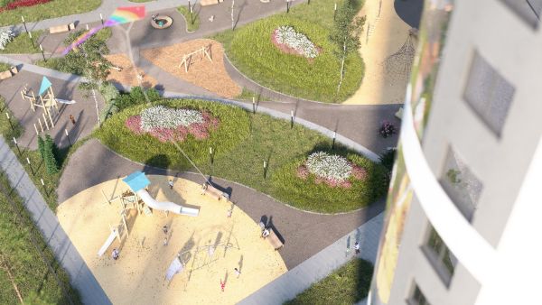 На территории выполнено эффектное ландшафтное оформление в концепции «Сад 4 сезонов». Пешеходные дорожки жилого комплекса вымощены брусчаткой. Внутренние дворовые территории квартала закрыты и полностью отданы под комфортные прогулочные пространства, современные детские игровые комплексы, зоны отдыха с беседками и качелями, спортивные площадки с тренажерами. Также на территории комплекса предусмотрена зона для дрессировки собак.